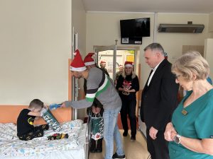 Od samego rana oddział został udekorowany świątecznymi akcentami. Największą atrakcją była oczywiście wizyta Świętego Mikołaja, który – w towarzystwie pomocników , którymi byli wolontariusze z Lotniczej Akademii Wojkowej w Dęblinie oraz Przedstawiciele Stowarzyszenia im. Karoli Majewskiej ,, Życie z chorobą nie musi być smutne’’ odwiedzili każdą salę, wręczając pacjentom drobne upominki.